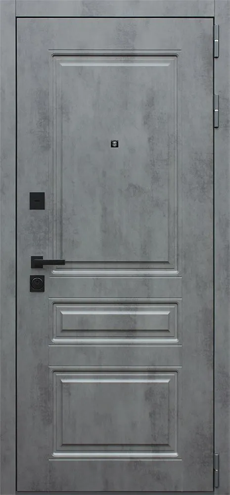 Внешняя отделка: Лист металла 1,5 мм. Экошпонированная панель МДФ 10 мм. Объемная фрезеровка. Цвет "бетон темный". Наличник МДФ 80 мм.
